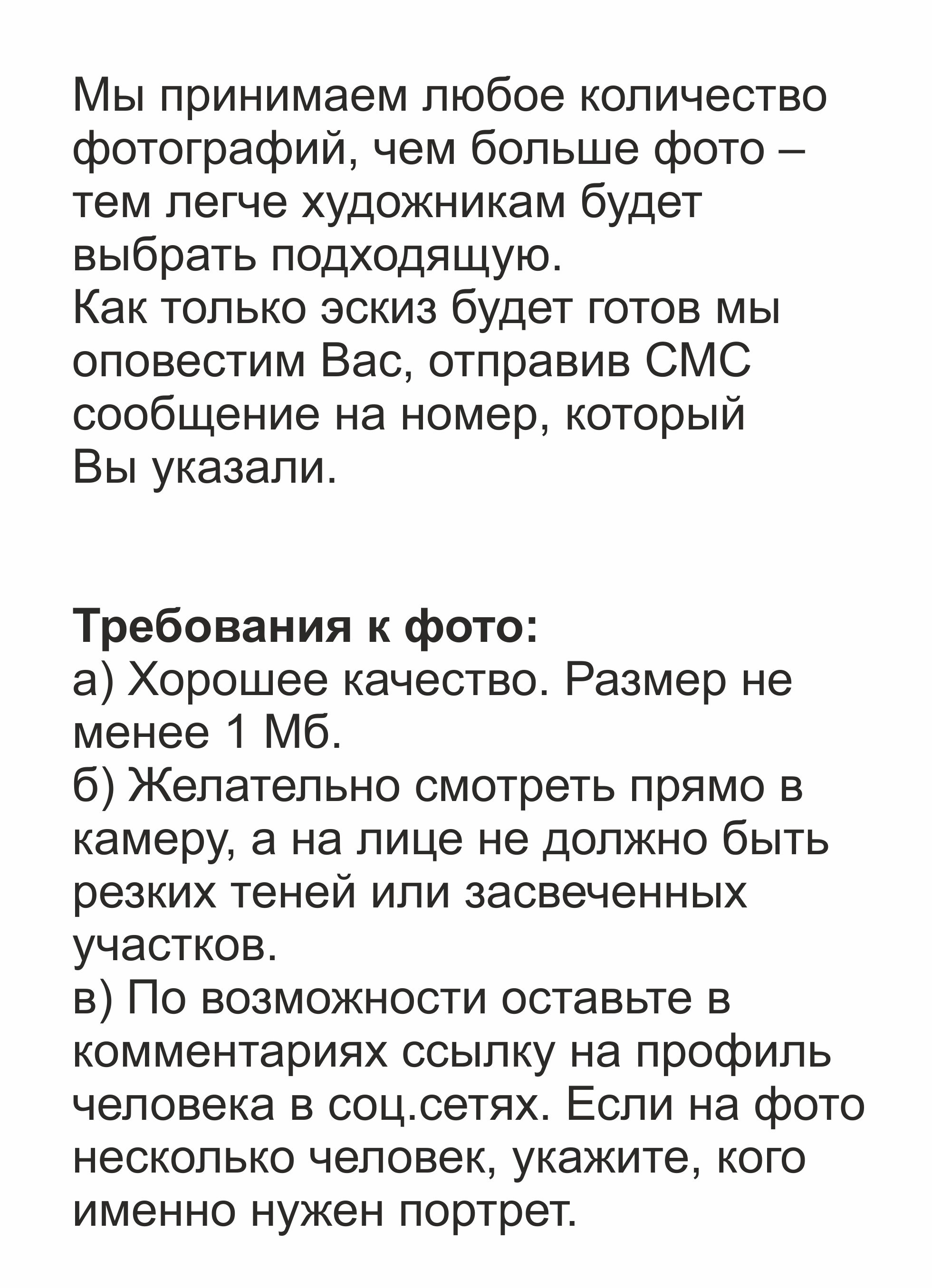 ПодзаголовокМы просим обратную связь после каждого заказа, это позволяет нам изо дня в день доводить качество создания портретов до совершенства.